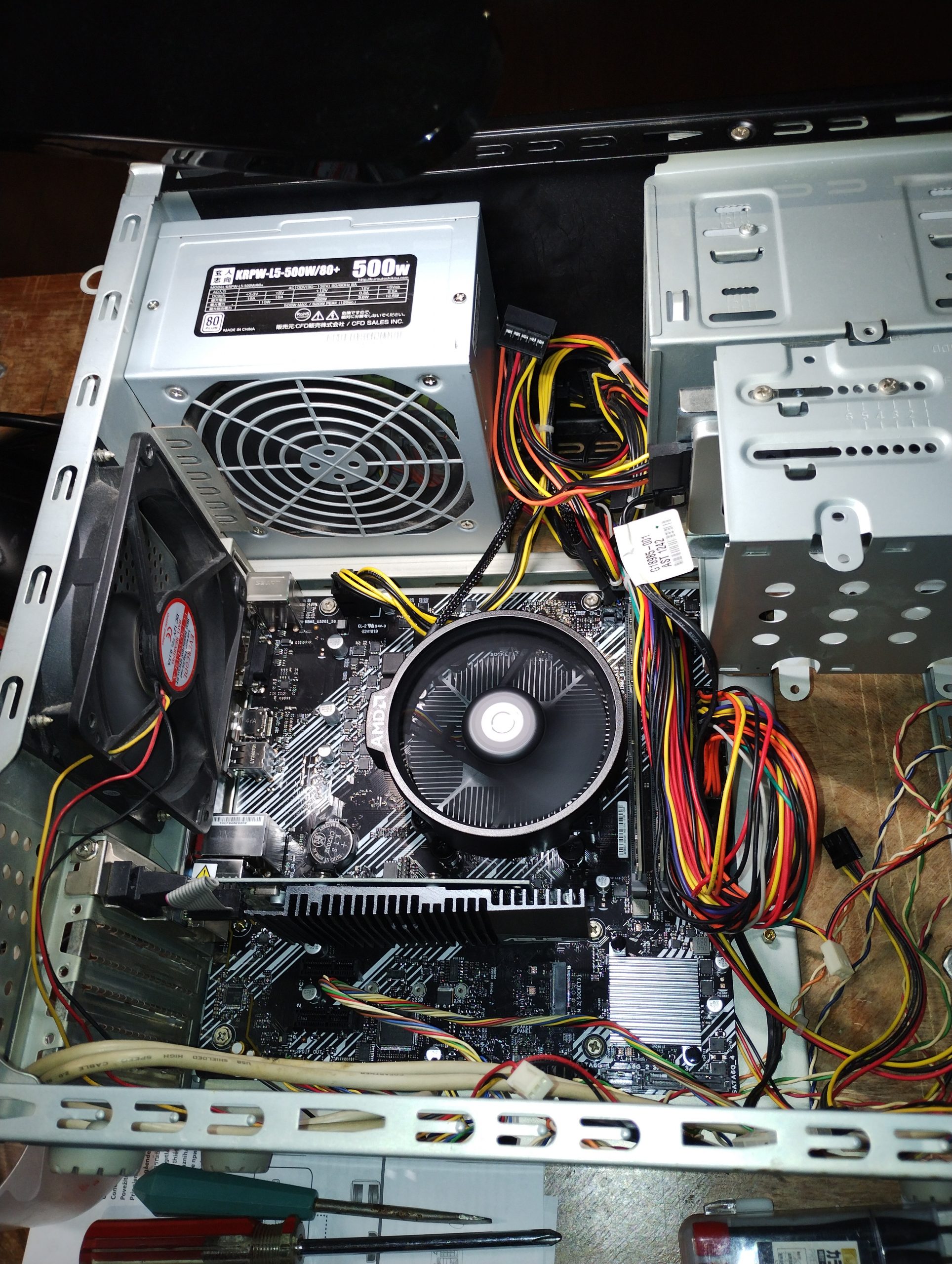 - これが大変。cpu fanはcpu付属のものを使ったが、これが中々の代物で、バネ付きのネジがうまく止まらないのだ。これが原因と思い、悪戦苦闘した。ネット上の記事でもはめにくいことが書かれていた。それを参考にファン部分とヒートシンク部分を外し、マザーボードの裏にあるパネルを抑えてなんとかネジ留めした。ワンタッチでつけられるタイプのものもあるのでそれを購入して使うのがいいと思う。やっとしっかり装着できたようだ。それとこの過程で判明したのが、cpu fanのコードの差し込み口が違っていたことだ。なんということだ!